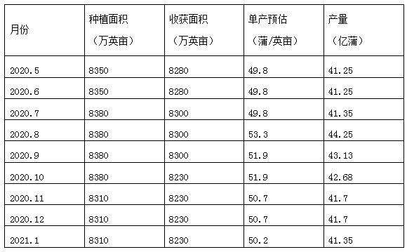 从上面的数据可看出,美豆产量的下调主要是单产的下调所致,而单产的下调原因则是8月份飓风的影响。当然,种植面积方面,相比2020年5月份的预估值8350万英亩也略有下调(8310万英亩)。考虑到美国农业部2021年1月预估对单产继续下调,因此也不排除在接下来的月份继续下调的可能,当然也存在上调的可能。不过考虑到本年度大豆已完成收割,后面继续大幅调整的可能性不大。
