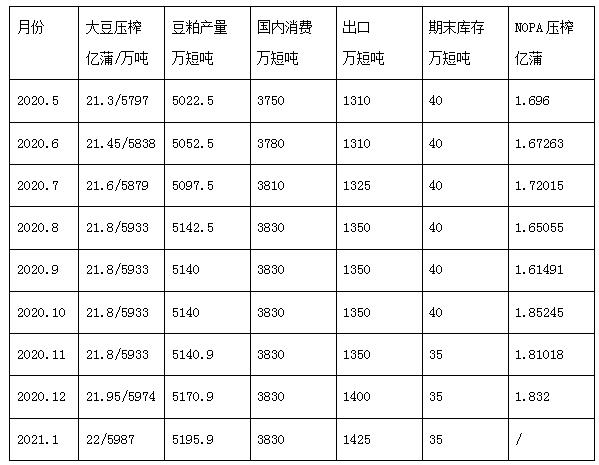 探索美豆期末库存大幅下调的各项,除了产量下调和出口增加(其中主要对中国)之外,还有美国国内压榨的增加。从USDA月报数据上看,2020年5月美豆压榨数据为5797万吨,到2021年1月增加至5987万吨,呈现缓慢增长态势, 与之相并行的NOPA数据同样体现了这一趋势,相佐证的数据还有美国国内豆粕消费和出口数据(消费和出口均呈现小幅增长的态势),如表2所示。
