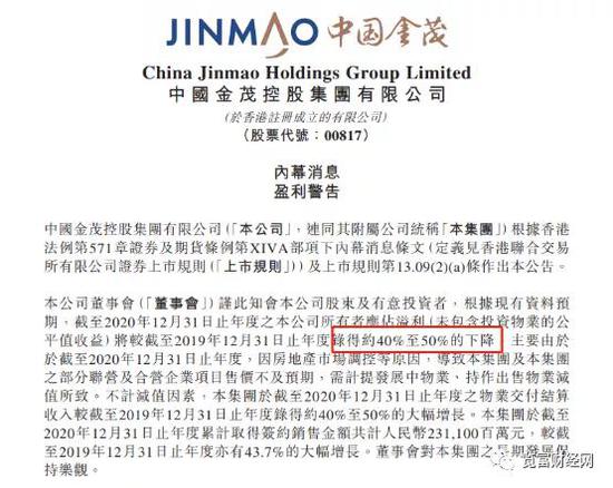 销售额的增加,但对业绩的贡献却有限。近日,中国金茂突发业绩预警,预计2020年全年盈利下降约40%-50%。因房地产市场调控等原因,导致集团开发项目售价不及预期,需计提资产减值。