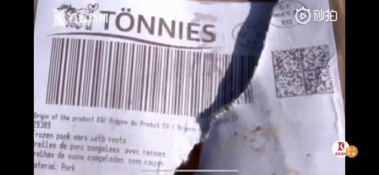 贴在冻肉外包装上的商品标签显示,该批冻肉包装日期为2020年11月16日,疑来自德国最大屠宰场“TONNIES”(“通内斯”)。