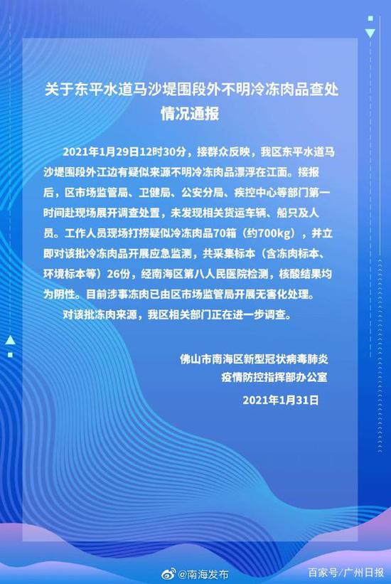 1月31日,佛山市南海区新冠疫情防控指挥部办公室发布《关于东平水道马沙堤围段外不明冷冻肉品查处情况通报》(以下简称《情况通报》)。