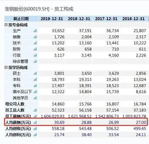 与此同时,2019年年报显示,宝钢高层薪酬多在百万元以上,人均薪酬更是达到30.7万元,在国内钢铁上市公司中排名靠前。