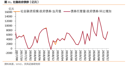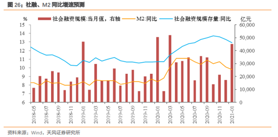 综合来看,我们预计2021年1月新增社融4.4万亿,较去年同期5.05万亿有明显回落,这主要是政府债券净融资下降所致,社融同比增速预计下行到12.9%左右。