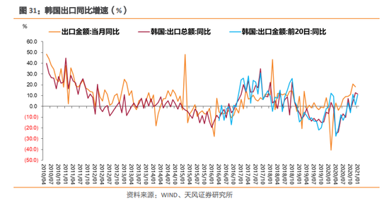 (4)去年12月韩国出口同比增速上行8.5%至12.6%,今年1月下行1.2%至11.4%,但11.4%的同比增速仍为近期高水平。