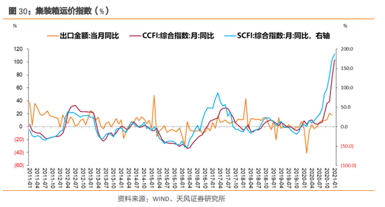 (2)去年12中国出口集装箱运价指数CCFI同比增速增幅扩大,从去年11月的39.08升至75.92(+),并于今年1月进一步走扩至103.06(+),当然过高的运价可能也会对出口规模形成制约。