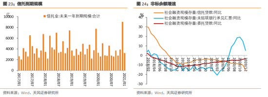 非标(信托贷款+委托贷款)方面,12月信托贷款超预期下滑主要与到期以及监管因素有关。监管部门曾要求2020年各家信托公司主动管理类融资信托规模在2019年末的基础上压降20%[1],不过由于受到疫情影响前面11个月(特别是上半年)压降幅度相对不足,因而赶在12月份集中压降。另外,2020年12月信托到期规模也明显超季节性,这也会使得信托贷款净融资下滑。