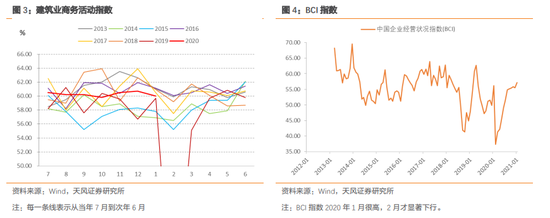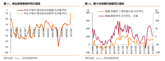 1-2月春节叠加低温,通常是施工淡季,因而建筑业景气度往往会出现季节性回落。1月建筑业商务活动指数小幅回落(降幅小于2017-2019年),同时房屋建筑业PMI依然还有回升,显示地产韧性依然较强,近期商品房销售从绝对值来看也不弱,景气度回落的可能主要是基建投资。考虑到盈利改善以及全球需求趋于回暖,预计制造业投资继续修复。由于基数原因,预计前两个月固定资产投资累计同比回到50%以上。