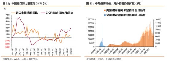 基于上述分析,再考虑低基数效应,我们预计今年1、2月中国进口同比增速约为18%,一季度进口同比增速约为15%。
