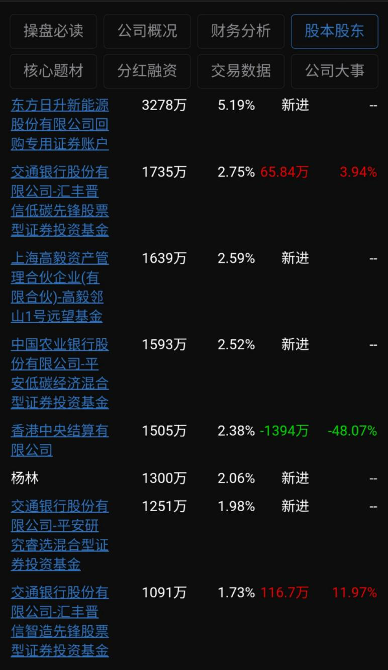 其中,汇丰晋信基金旗下的2只基金分别位列东方日升的第二、第八大流通股股东,平安基金旗下的2只基金分别位列东方日升的第四、第七大流通股股东,上海高毅资产管理合伙企业(有限合伙)-高毅邻山1号远望基金为东方日升的第三大流通股股东。