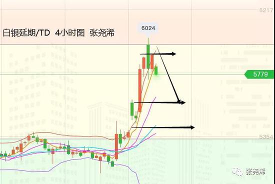 今日周二,银价自昨日晚盘再度高开至5968元,但在刷新高点至6024元/千克后产生回落,目前白盘时段,最高回落近300元空间,走势仍保持其力度,就此在6000元关口附近进场的空单也随即大幅获利中。周线级别虽偏向看涨,但日线及其以下周期有回落风险,关注其回落空间。
