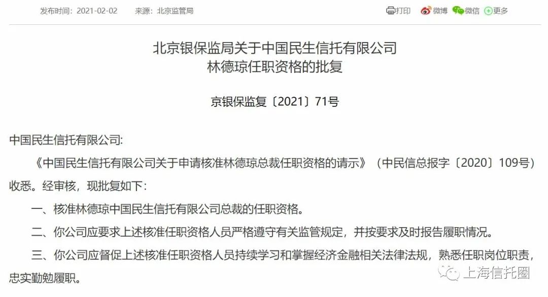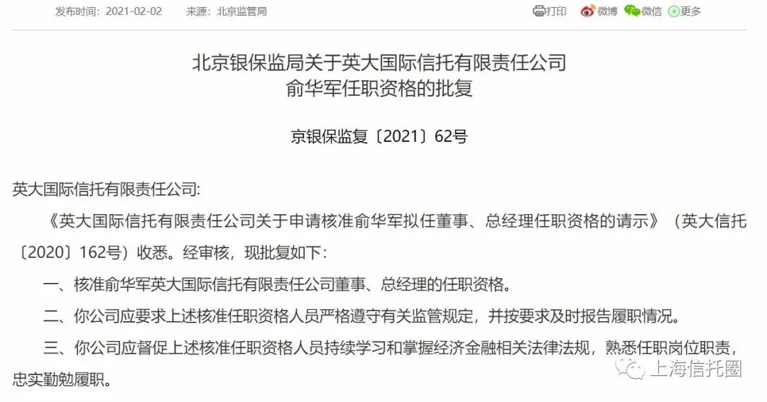 2月2日,中国银保监会官网披露3家信托公司总经理任职资格的批复。其中:英大信托新任总经理为俞华军、外贸信托新任总经理为刘剑、民生信托新任总裁为林德琼。