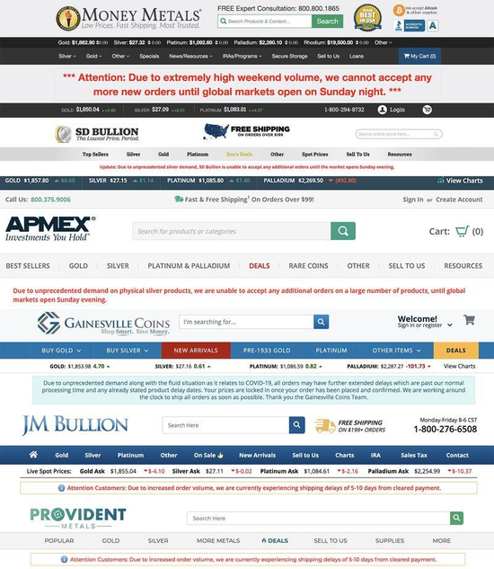据零对冲,包括Money Metals、SD Bullion等实物白银销售网站都已经暂停了实物白银的销售。