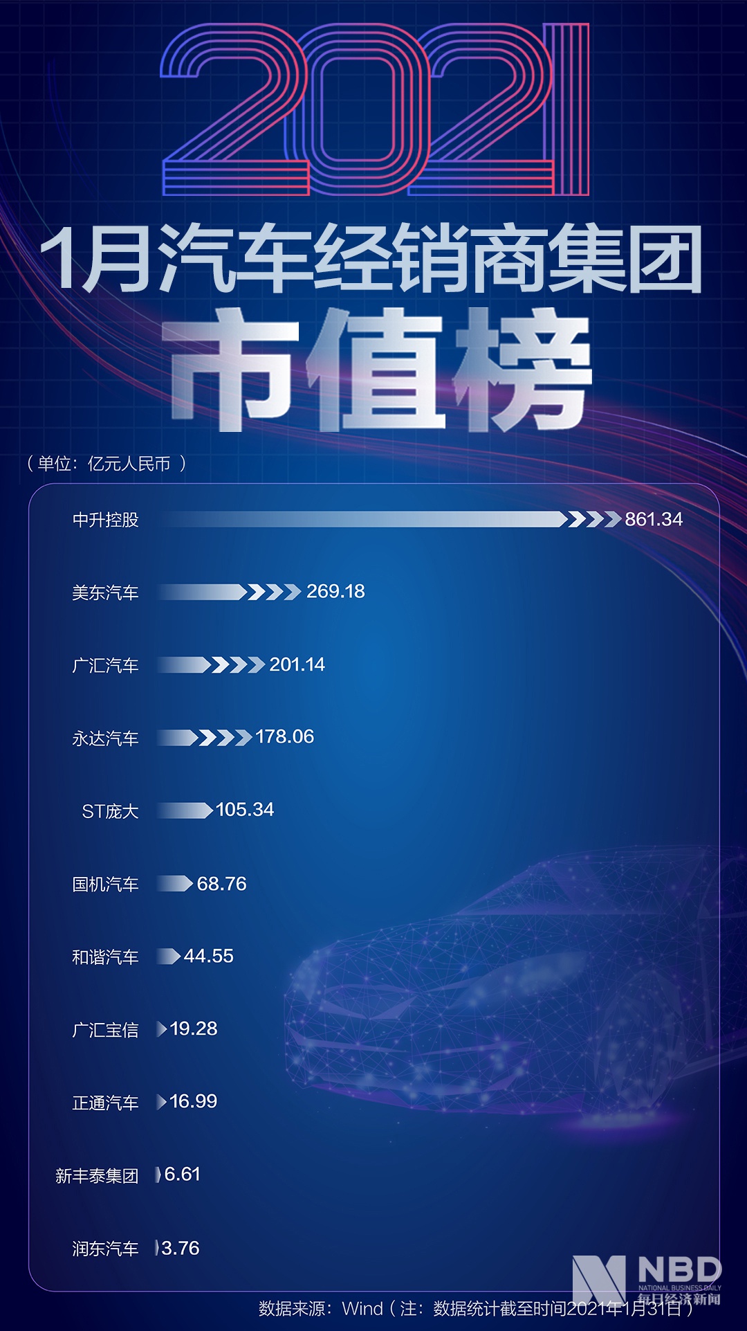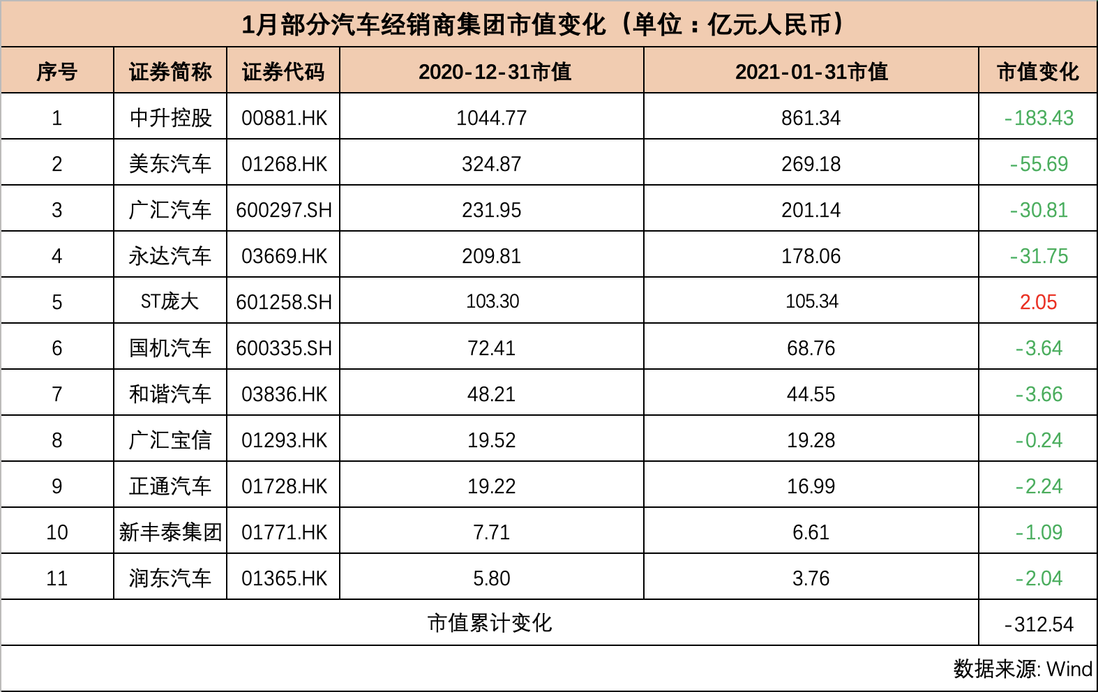 汽车经销商集团方面,2021年1月,11家经销商集团中,仅有ST庞大一家市值较上个月有所提升,约为105.34亿元,增长1.98%,其余10家市值较上个月均出现不同程度的下滑,市值累计减少312.54亿元。
