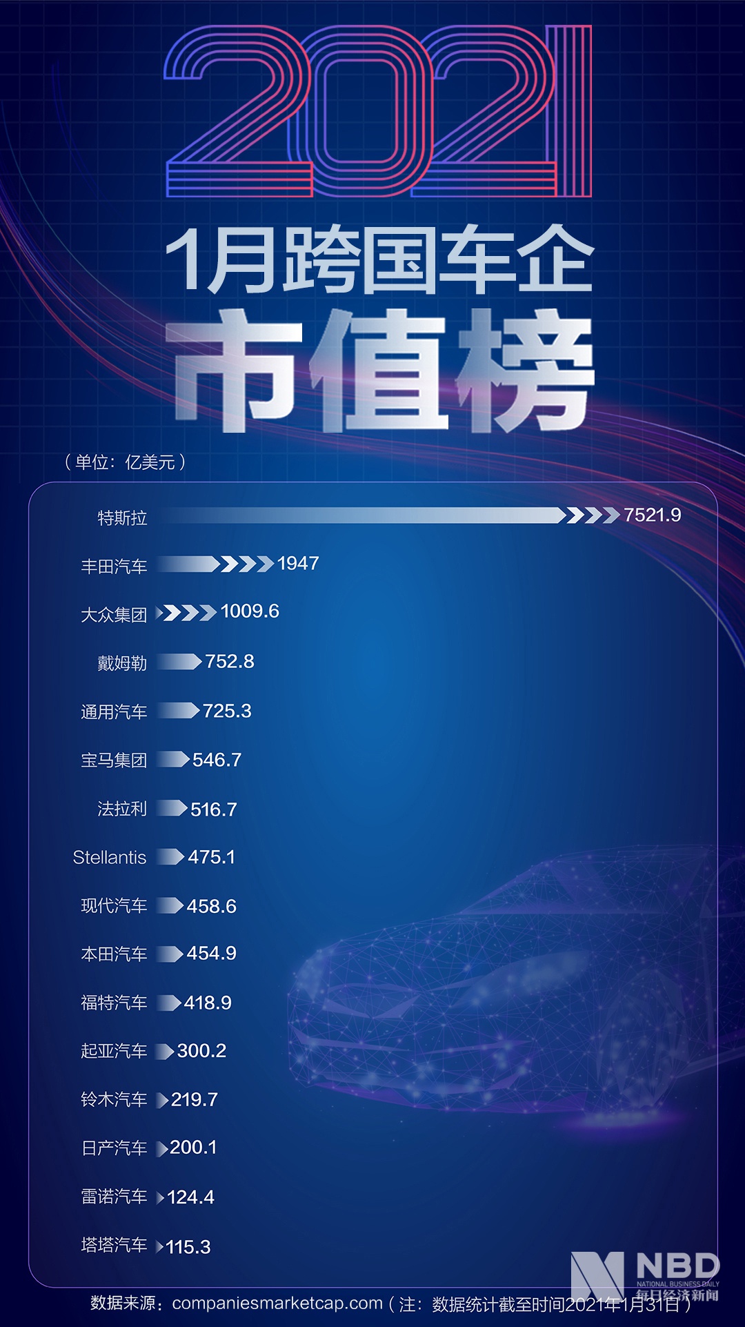 跨国车企方面,据《每日经济新闻》记者不完全统计,2021年1月,16家跨国车企中,有9家市值“飘红”。其中,三家整车企业市值环比增长超过30%,涨幅最大的是塔塔汽车,市值约为115.3亿美元,比上月增长39.76%;其次是起亚汽车,市值约为300.2亿美元,比上月增长33.96%。