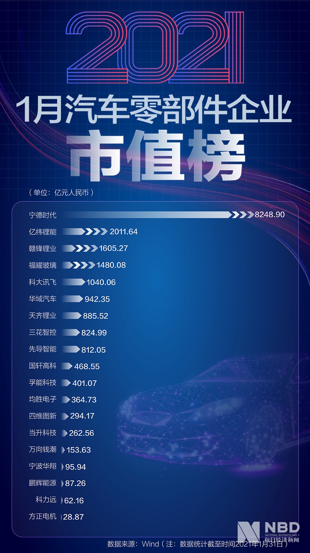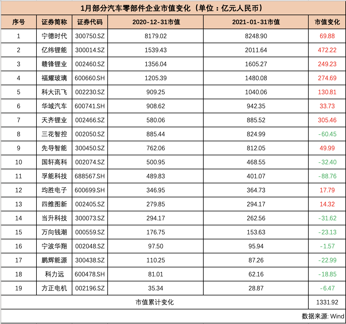 2021年1月,汽车零部件板块整体表现亮眼。19家零部件上市公司中,有9家出现股价下跌,市值累计增加约1331.9亿元。