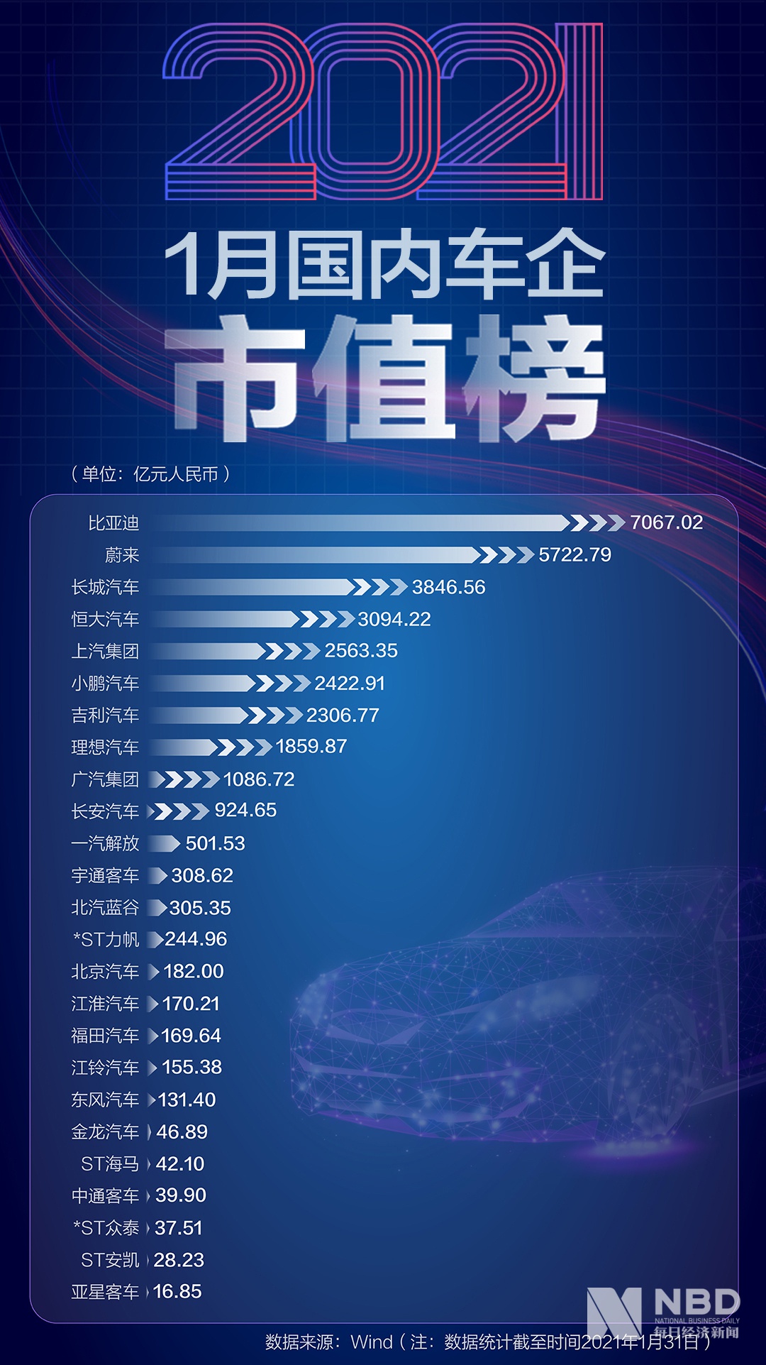 具体来看,国内整车企业市值排行前三位的分别是比亚迪、蔚来和长城汽车。其中,比亚迪市值在1月增加约1766.2亿元至7067亿元;在美国上市的蔚来(NIO)1月最后一个交易日的市值约为5722.8亿元;长城汽车1月市值约为3846.6亿元。