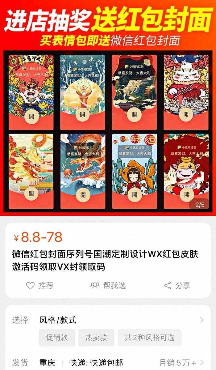 目前,淘宝上出售的微信红包封面很是多样,有牛年主题、二次元、国潮、情侣款、萌宠风,也有全球经典IP、游戏主题、文字主题等等,这些封面上可在高年龄群体中流传,下可满足年轻用户的口味,比品牌方定制的红包封面市场庞大得多。
