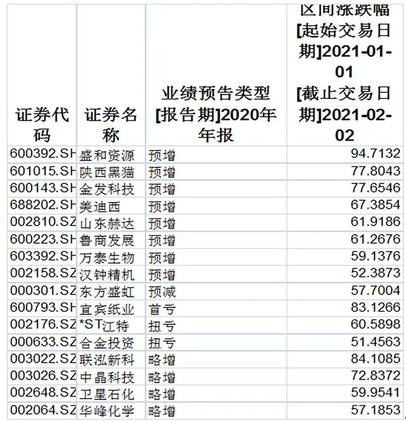 Choice数据显示,今年以来(截至2月2日),剔除次新股,有23家公司涨幅超过50%,其中16家披露了业绩预告,其中近九成公司预增、略增或者扭亏。