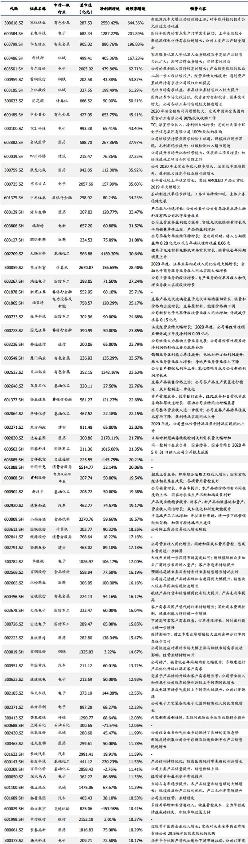 国盛证券将实际披露情况与截至 2020年底市场的一致预期进行对比,增速高出10%定义为超预期,显示共有224个股票业绩超预期。进一步筛选市值大于200亿元,同时业绩提升主要由主营贡献的超预期个股,共68个,其中电子、医药、有色金属和基础化工等行业分布较多。