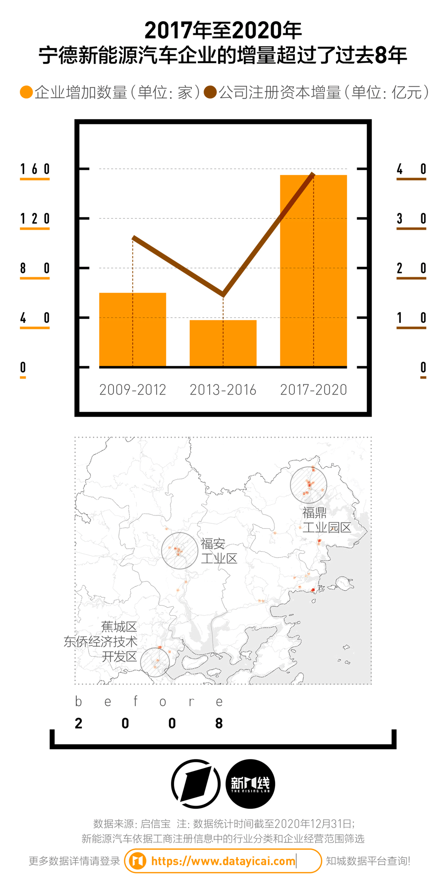 不过宁德当地新能源汽车产业的真正高速发展要更晚一些。2018年,宁德时代作为电动汽车电池业的龙头企业上市,随后宁德围绕动力电池产业的企业数量和注册资本增量才有了更为显著的增长。