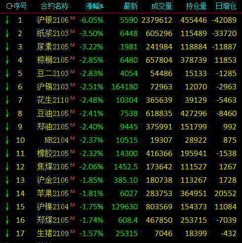 热点栏目2月3日,国内期市多数收跌,沪银跌逾6%;能化品分化,PVC、原油涨近2%,纸浆、尿素跌逾3%;油脂油料普跌,棕榈油、豆二、花生、豆油、菜油跌逾2%;有色中,沪锡跌逾2%。