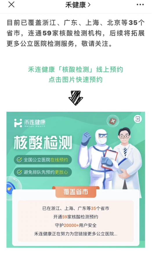 该文章表示,通过禾连健康公众号就可以预约有关医院的核酸检测,并链接了预约小程序。