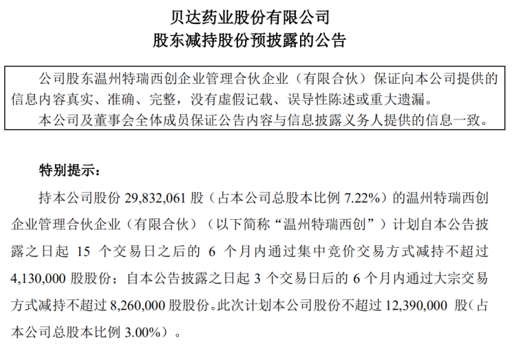 然而,与股东大会决议公告同时发布的还有一则减持公告,贝达药业股东温州特瑞西创计划减持公司股份1239万股,占公司总股本比例为3%,大有借利好套现的嫌疑。
