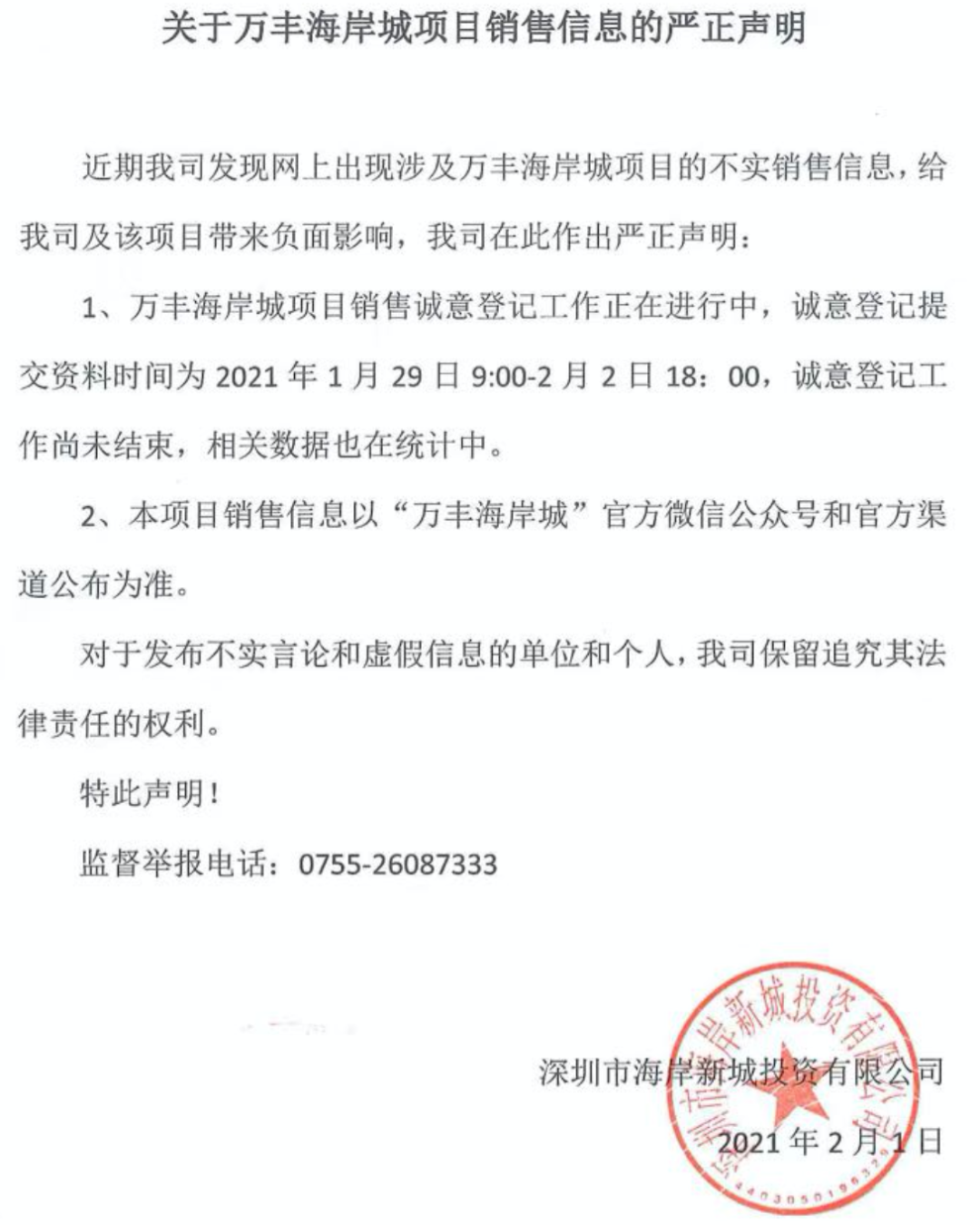 该盘于1月29日开放登记,仅三天时间,网上就有消息称,万丰海岸城的诚意登记中,已有上万批客户社保缴纳月数超过200个月。于是2月1日,深圳海岸新城投资有限公司紧急澄清,登记工作尚未结束,网上出现的销售信息均不实。