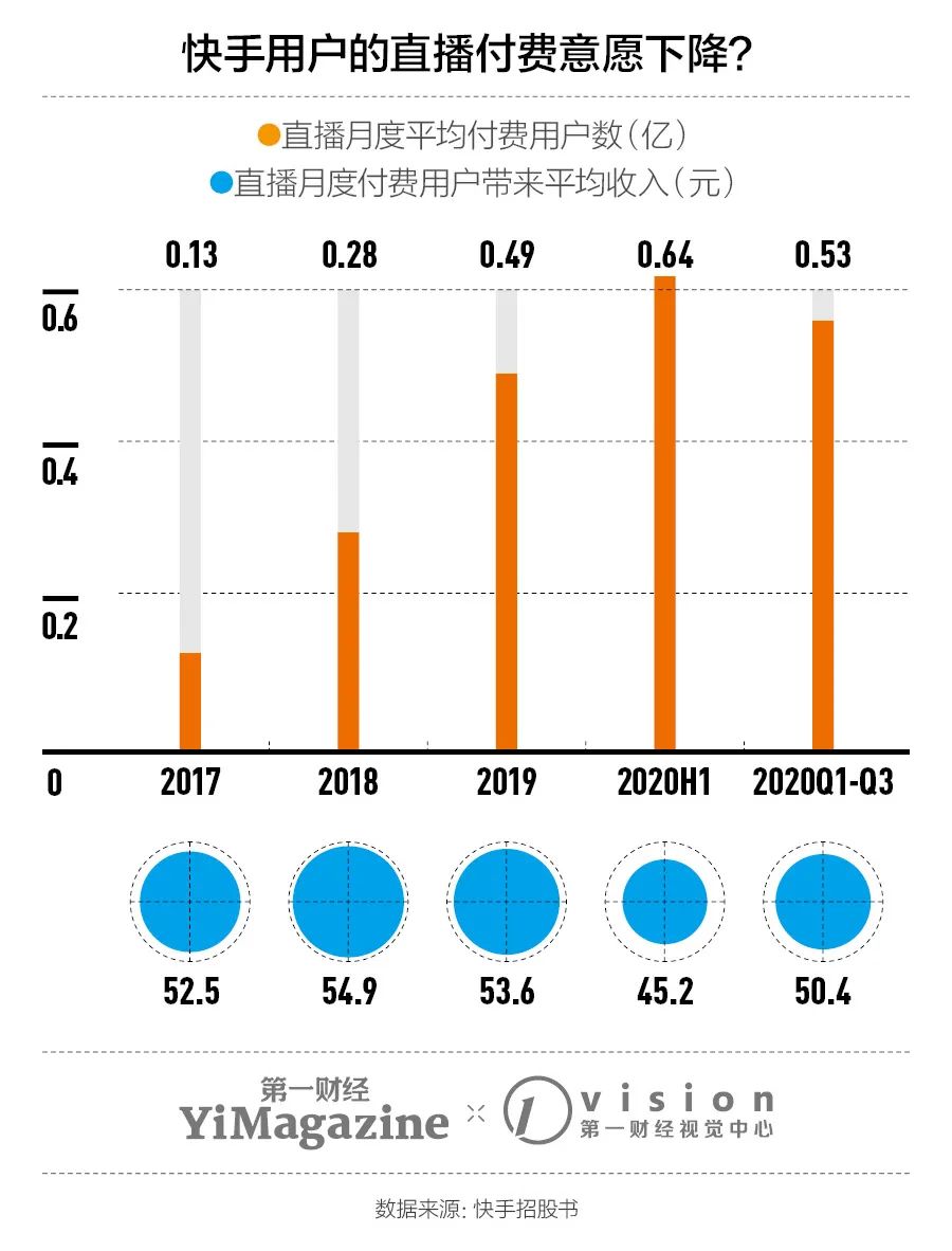 快手官方在2020年6月面对卖货商家推出广告营销工具“小店通”,引导商家利用快手的公域流量来获客后,上述曲折买量的方式已经有所缓解。这基本可以解释为什么2020年前三季度,快手直播业务的付费用户收入相比2019年同期水平略有下降,同时,直播月度平均付费用户数相比2020年上半年的数据,也有明显下降。