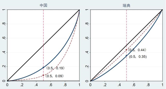 资料来源:中国的曲线根据CHIPS2018年调查数据计算绘制。瑞典的曲线根据Nieuwenhuis,Nelson和Alm在2020年发表论文中2003年的基尼系数与集中度的数据模拟绘制。