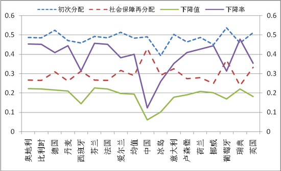 我国社会保障制度在平抑一次分配差距方面还远没有发挥应有的作用。据北师大收入分配研究院2017年的一项研究,18个欧盟国家市场收入的基尼系数为0.443,在社会保障的作用下,这些国家的可支配收入基尼系数降为0.29。从下降幅度来看,欧盟国家政府的社会保障政策使得其基尼系数的平均值下降了40%,相比之下,中国仅下降了12.3%。
