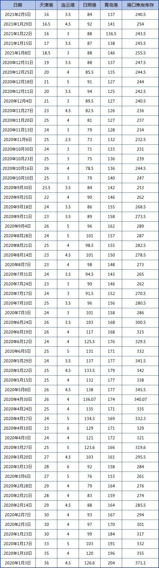 以下为2020年1月以来国内港口焦炭库存总量及天津港、连云港、日照港和青岛港库存(万吨)
