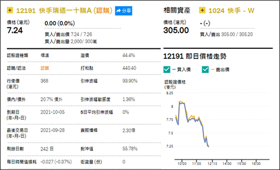 短视频第一股快手(1024.HK)今日正式登陆港交所,其以招股价上限115港元定价,获得超1200倍超额认购,昨日晚间暗盘市值曾一度涨超260%,资金追捧度高。快手今日开盘上涨近194%,报338港元,早盘最高上冲至345港元,及后升幅有所收窄,徘徊于300港元整数位上方。作为短视频龙头之一,快手去年前九个月电商GMV达到2041亿元人民币,用户日均使用时长超85分钟,给予股价支撑。此外,市场亦憧憬快手后续纳入科指等大型指数机会。若看好快手后市表现,可留意其认购证12191,行使价368港元,今年10月5日到期;或另一只快手价内认购证12174,行使价300港元,今年8月4日到期,投资者可视乎自身风险承担能力理性选择。