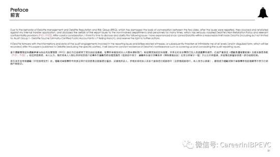 德勤北京一组的一名员工在2月3日晚将一份50多页的PPT文件群发公司邮件,举报了4年工作期间各种不合规的人和事。
