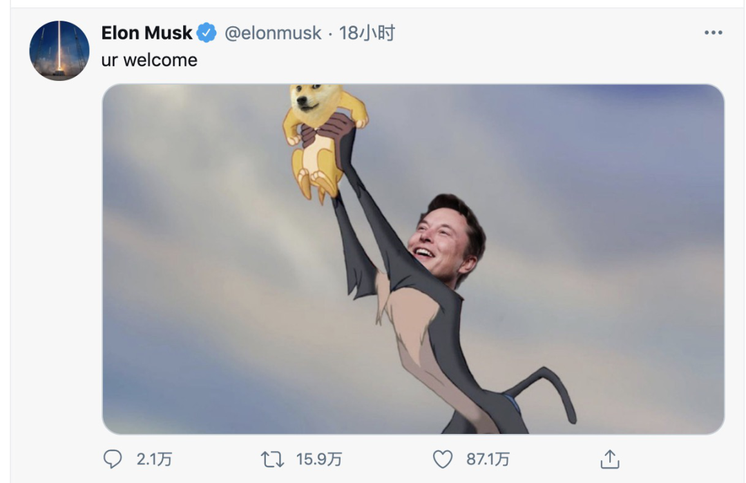 过了一会儿,马斯克又发推自夸称“不用谢”,同时转发了一条网友制作的恶搞图片:马斯克化身电影狮子王里的狒狒长老,高高举起“狗狗币”。