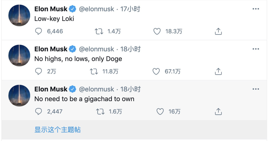 紧接着,马斯克又发了几条推特,他说,“我们不需要成为亿万富翁就能拥有狗狗币,狗狗币才是人民的数字货币。我没喝多,也没情绪低落,心里只有狗狗币。”
