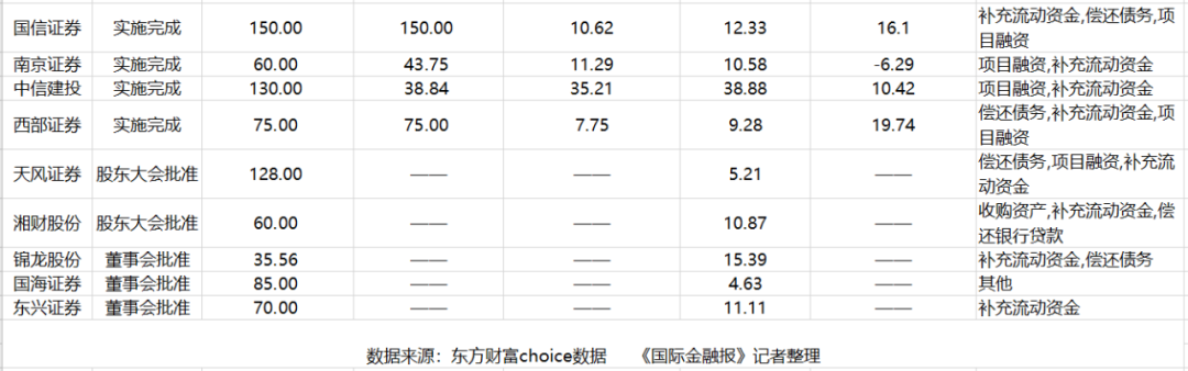 《国际金融报》记者统计获悉,截至2月4日,近一年来11家上市券商定增落地,预计募资1048.18亿元,实际募资885.72亿元。此外,天风证券、浙商证券等6家券商正在定增的路上,预计募资总额为478.56亿元。券商定增目的大同小异,包括补充流动资金、偿还债务、收购资产等。