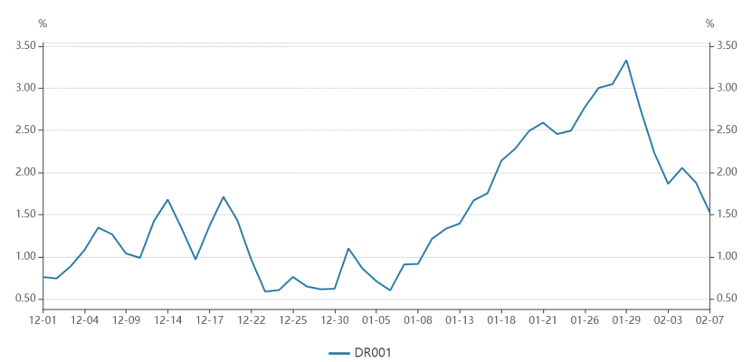 此外,2月7日是周日,但也是工作日,央行开展了500亿元14天期逆回购操作,实现全额净投放。当日,隔夜Shibor和DR001均大幅下行。