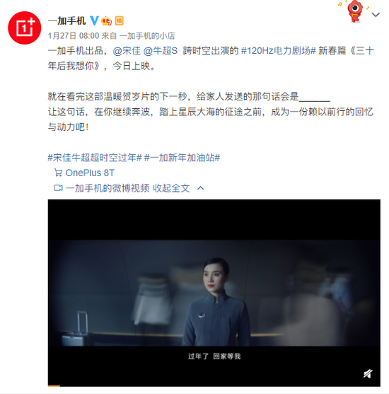 1月27日,一加手机官方微博发布由宋佳、牛超出演的贺岁微电影《三十年后我想你》并配文称,就在看完这部温暖贺岁片的下一秒,给家人发送的那句话会是......让这句话,在你继续奔波,踏上星辰大海的征途之前,成为一份赖以前行的回忆与动力吧!