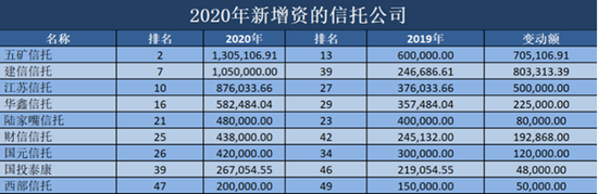 由于2020年5月《信托公司资金信托管理暂行办法(征求意见稿)》发布,净资产规模对信托公司客户集中度和固有业务的开展有着直接影响,信托行业由此迎来增资热潮。