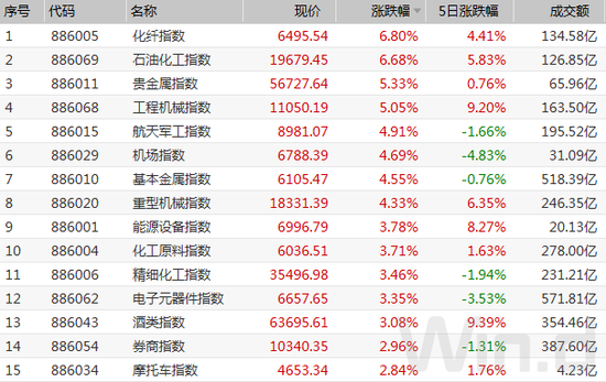 2月9日,从板块涨幅来看,化纤板块大涨6.80%,位居首位;石油化工板块涨幅亦超过6%;贵金属、工程机械、航天军工、基本金属等板块涨幅位居前列。