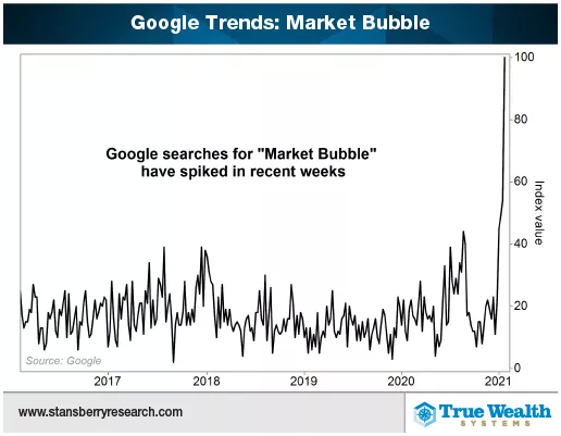 根据谷歌的搜索趋势数据显示,当前市场搜索“市场泡沫”的次数比过去五年中任何时候都多。