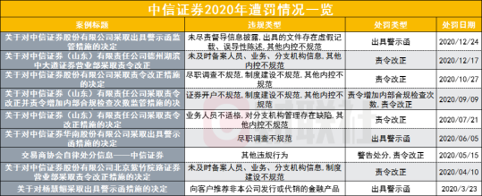 本应作为行业标杆的中信证券,2020年以来频频遭罚,处罚次数高达8次,几乎一个半月被罚一次,部分违规行为堪称严重。