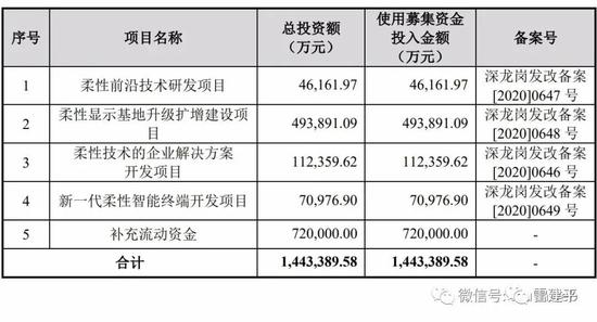 2020年12月底,柔宇转战科创板,计划募资144.34亿元。其中,4.6亿元用于柔性前沿技术研发项目,49.39亿元用于柔性显示基地升级扩增建设项目;