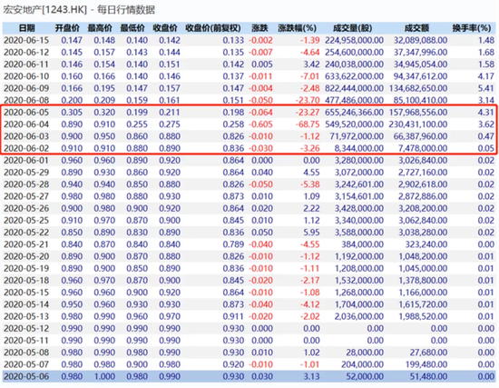 图 16:2020年6月4日午后宏安地产遭到砸盘,跌幅达68.8%