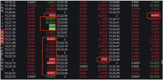 5)阶段五:高位横盘震荡出货。高位横盘震荡期间,庄家疑似通过各类“民间炒股群”、“民间炒股直播课”、“民间神秘代码”等渠道诱导散户高位接盘,从而完成出货目的。12月22号,相关“代理”大力推荐散户15:20-16:00大幅买入艾硕控股股票。从wind数据可以看到,当天15:20-16:00点之间,股票成交量突然暴增。15点20突现巨额买单和卖单,两手卖盘高达近400万股,并伴随几十到100万不等的买盘分批介入,仅当天成交量达1.27亿股,显著放量,大概率是散户接盘,庄家高位出货跑路。