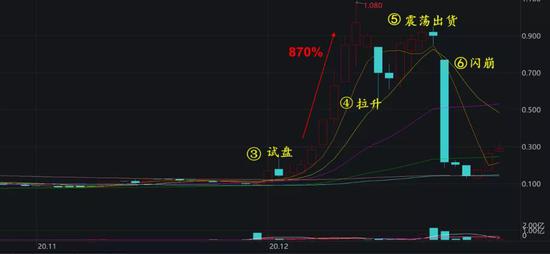6)阶段六:股票闪崩。在12月22日散户高位接盘后,庄家可能完成出货目的,第二天也就是12月23日后,股价闪崩,当日跌幅高达76%,散户成功被割韭菜。