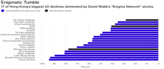 2017年5月15日,大卫.韦伯(David Webb)在其网站上公布了一篇文章“谜网:50只不能买的港股(The Enigma Network: 50 stocks not to own)”指出有50只港股存在很高的风险,这些股票股权相对集中,而且存在大量的交叉持股,相互之间的关系错综复杂。例如中国投融资(01226.HK)持有创业板股份汇隆控股(08021.HK)等3只港股的股权,但同时又持有中国环保能源(00986.HK)等另外3家港股公司股权。康宏环球(01019.HK)的股权架构亦十分复杂,最少被另外6间上市公司持股,相关股权总计逾30%,疑似为该网络的核心成员之一。