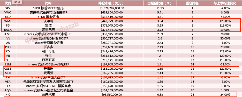 四季度美股持仓的调整主要有两方面特点:一是增持消费。四季度增持的消费股包括沃尔玛、宝洁、可口可乐,强生、百事可乐、开市乐、麦当劳等。二是增持中概股,四季度增持阿里巴巴,按股份变化数计,增持幅度为19%;增持拼多多,幅度达29%。此外,四季度桥水基金还增持了造车新势力蔚来汽车24%。