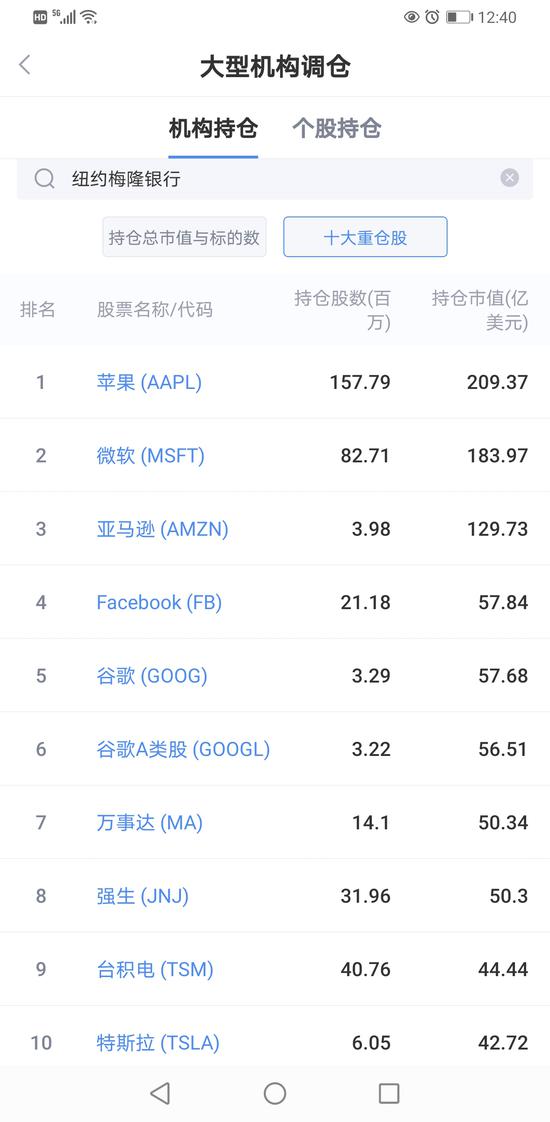 纽约梅隆按市值比例排名的前5大重仓股分别为苹果(AAPL)(4.63%)、微软(MSFT)(4.07%)、亚马逊(AMZN)(2.87%)、Facebook(FB)(1.28%)、谷歌(GOOG)(1.28%)。按持股数量计算,持有比例变化分别为-4.98%、-1.94%、-7.11%、-6.46%、-6.44%。其他的五大重仓股还有谷歌A类股、万事达、强生、特斯拉,与美国主流投资机构的抱团相当紧密,唯一略让人有些意外的是台积电入围。
